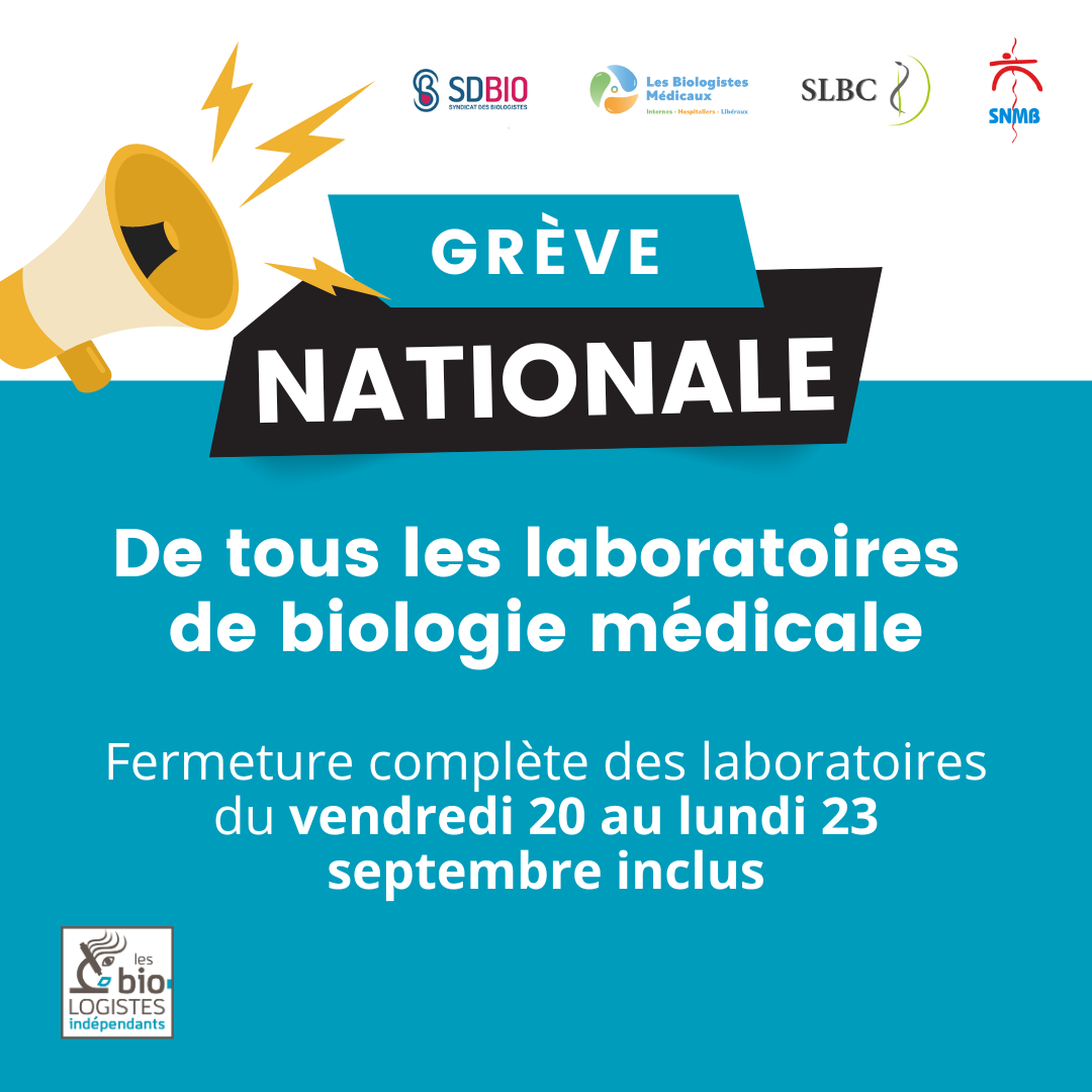Vos laboratoires LABIO fermeront du vendredi 20 au lundi 23 septembre prochain, en raison d'une grève nationale des biologistes médicaux. Cette mobilisation pourrait être reconduite.