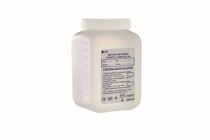 Nb : Dans l'intervalle des trois heures, toutes les urines doivent être récupérées dans le flacon. Cette recherche n’est pas réalisable pour la femme en période de règles.